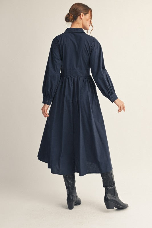 Long sleeves button down midi dress with side pockets, waist tie, front pleat accent.