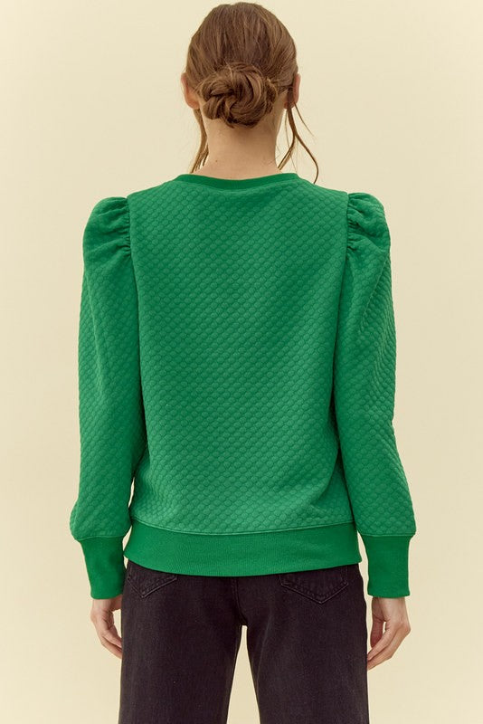Solid textured fabric lovely sweatshirt with puff shoulder accent.